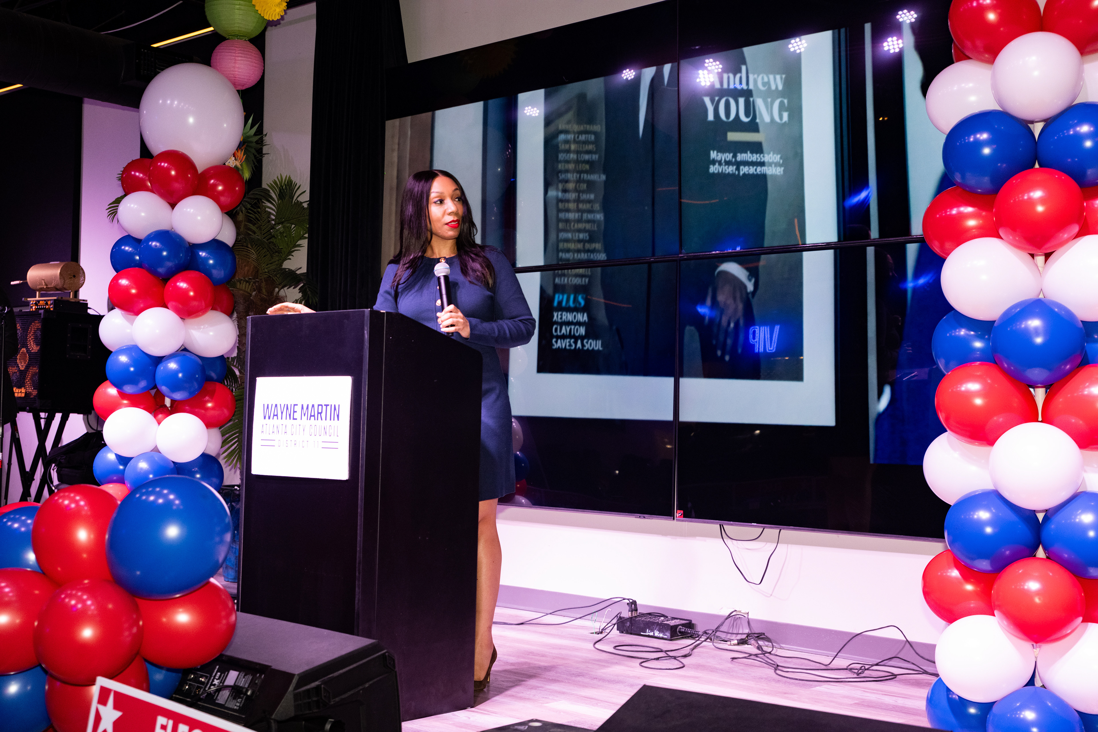 Freeman speaks at the victory party for Councilman Wayne Martin II. The two met in college, and she served as Finance Chair of his successful campaign for Atlanta City Council District 11. (Photo/Noah Cathey)