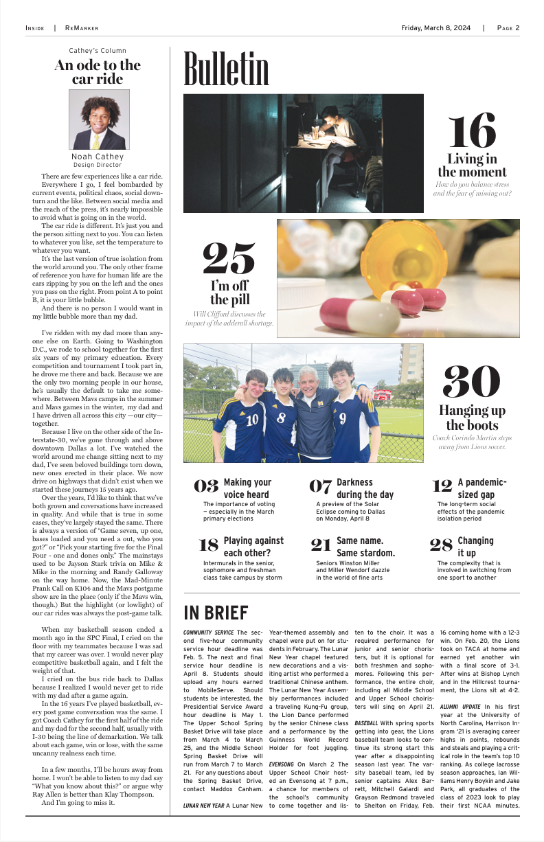 This is page 2 from the March 2024 paper. The featured column, "An Ode to the Car Ride" was named best in the nation for First-person experience writing.