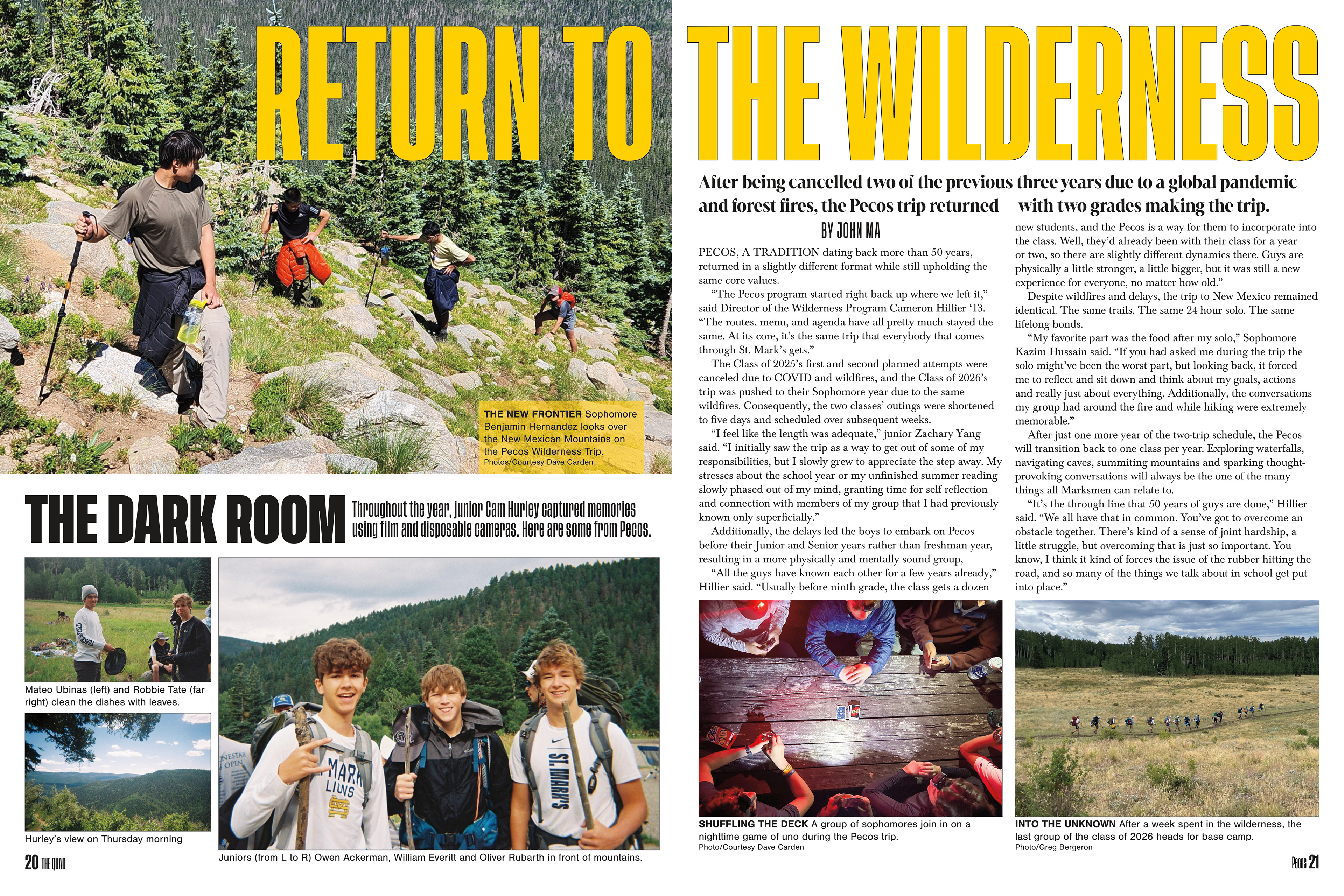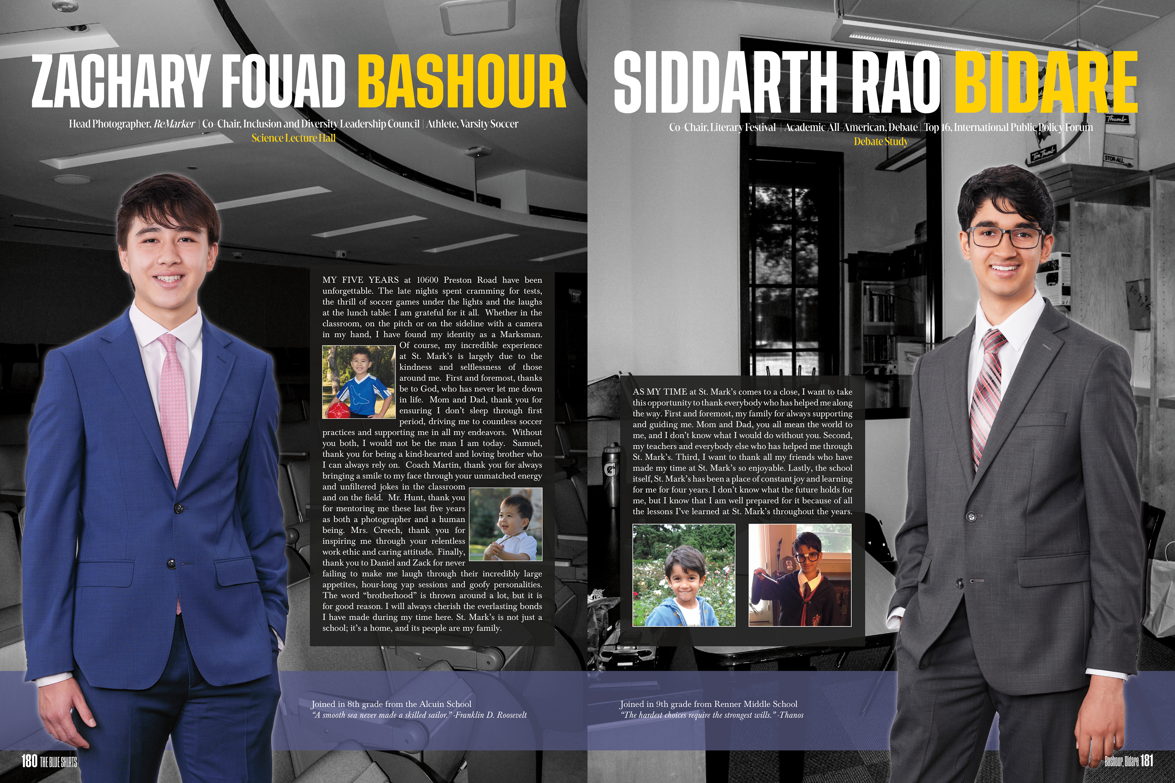 It is a tradition at St. Mark's for every senior to have one page to themselves. In addition to the traditional parting words, baby pictures, top accomplishments and senior quote, I chose to reimagine the page and connect it to theme by also highlighting each student's favorite spot on campus in gold text and their page's background.
